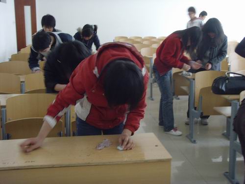 卫生部和承然环保协会联合举办的“拒绝课桌文化 我们在行动”活动在明水校区如火如荼地进行中。本次活动,旨在清理教学楼课桌上的字迹,还大家一个干净整洁的教室。