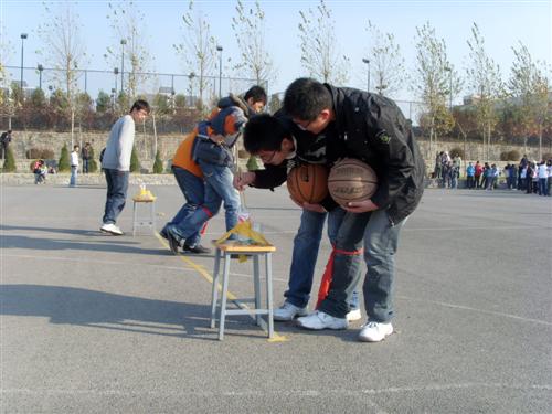 此次趣味运动会包括“绑腿跑”“三心两意”“铁人三项”“比翼双飞”四个项目。“绑腿跑”中女子组三人一组,男子组是两人一组。参赛选手要同时拍打篮球,并齐步快跑,以最短的时间到达目的地;“三心两意”项目中,选手一手运球,一手持拍托乒乓球快跑;参加“铁人三项”的选手需要擅长跳绳、排球和篮球,优异的表现令观众连连叫好,想起掌声阵阵;“比翼双飞”中选手背靠背夹住气球,两人齐心协力,完成气球的运送。
