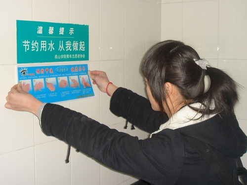 日前,探花视频 基本功部成员到章丘疾控中心学习了相关预防甲型H1N1流感及“六步洗手法”的知识。15日晚上7点,基本功部成员在校园各个净手处(洗手间、食堂、宿舍的公共洗漱间)张贴印有“六步洗手法”图样的宣传画报,指导大家用科学的方法净手。同学们看到宣传画后,纷纷表示“六步洗手法”及时又实用,对大家预防甲型H1N1流感很有帮助。