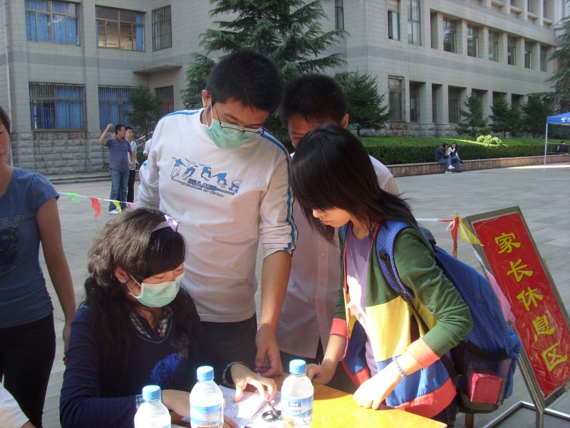 学生会各部门工作人员在3号教学楼前开展迎新工作。