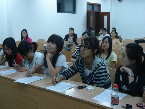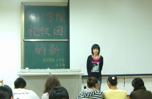 参加礼仪团纳新的女生落落大方,举止优雅,平均身高在165cm左右。首先选手自我介绍,大家纷纷表示希望通过礼仪团这个平台提升自身的气质,加深自己的内涵。然后评委针对选手的特点提问,考察选手对生活中就餐、宴会、交谈等礼仪的考核,选手们认真回答,评委针对选手的回答情况进行点评。