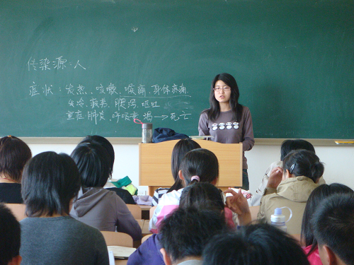 入秋以来,全省多所高校发生了聚集性甲型H1N1流感,鉴于此,当天的指导班会特意强调了有关甲型流感的情况。姬广颖同学先后讲述了甲型流感的传染源、发病症状、预防措施以及出现疑似病例后应该怎么做等,希望新同学注意防范,加强锻炼,尽量避免出现感冒的情况。