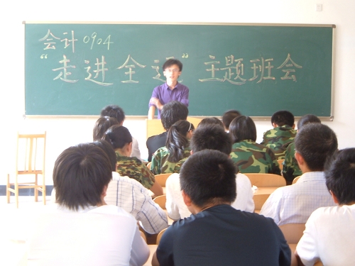 班会由作为赛会志愿者的两位学生辅导员赵浩然和范婷两位同学组织。他们给新生们介绍了全运会的标志象征,赛场布置,赛程等。赵浩然同学还介绍了今年暑假时志愿者们为测试赛服务的点滴。据悉,为响应全民全运,会计0804与会计0904还进行了友谊篮球赛。