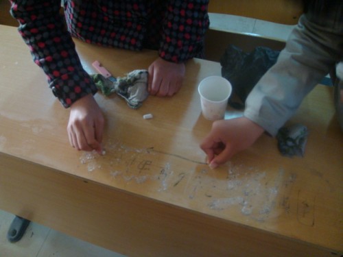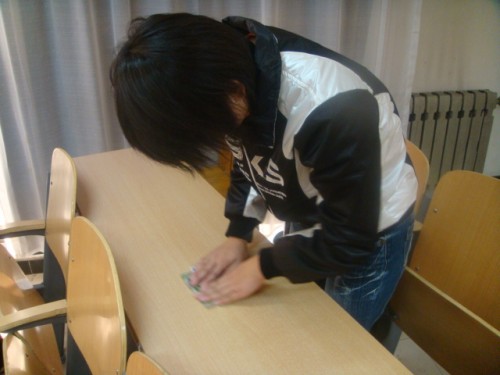 2点整,100多名同学自带抹布、橡皮、小刀等工具来到教学楼,开始了他们的清洁工作。大家先用抹布整体擦过一遍,接着用橡皮和小刀对污垢进行具体清理。如何清除记号笔等顽固字迹,费了大家不少力气。一位同学建议先用粉笔覆盖再用抹布擦除,取得了较好的效果。最终,大部分课桌都恢复了他们本来的面目,令人十分欣慰。