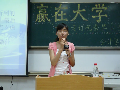 讲座尚未开始,同学们已提前到场,现场座无虚席。此次讲座分为经验讲授和自由提问两个环节。首先由考入莱芜税务局的张裕介绍公务员报考的相关事项。他结合自身经历,就考前计划、考查重点、复习策略、面试准备等四方面问题进行了简要分析;其中,张裕强调积极心态和勤奋坚持尤为重要,一句“从菜鸟到大师的距离,就是练习”更是鼓舞人心。随后,成功进入毕马威会计师事务所北京分所的田芃,针对注册会计师方向的考试科目特色、学习方法以及进入“四大”的审核流程进行说明。在整个讲座中,生动幽默的语言、实用有效的建议让在场观众获得宝贵参考意见,可谓受益匪浅。最后由即将进入华北电力大学继续深造的秦镇,就银行与考研方向进行针对性介绍。据悉,在2010年中国人民银行的招考中,秦镇成功考入中国人民银行淄博分行,因此她对于招考流程、考试内容以及注意事项有较为客观正确的认识。秦镇从自身出发,突出强调了夯实专业基础的必要性和重要性;而谈及感悟与经历,她提出不仅要坚持学习,更要坚持理想。之后的提问环节中,观众踊跃提问,将心中疑惑一一道出,而嘉宾亦积极回应,认真作答。当晚九点半,讲座在一派和谐氛围中圆满落下帷幕。