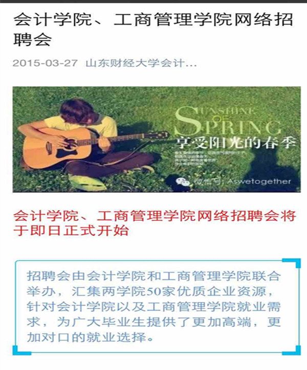 就业信息发布微信平台:“探花视频 会计学缘”(微信号“Aswetogether”)、“商院就业办”(微信号“scdgsjyb”),热烈欢迎广大同学积极关注。