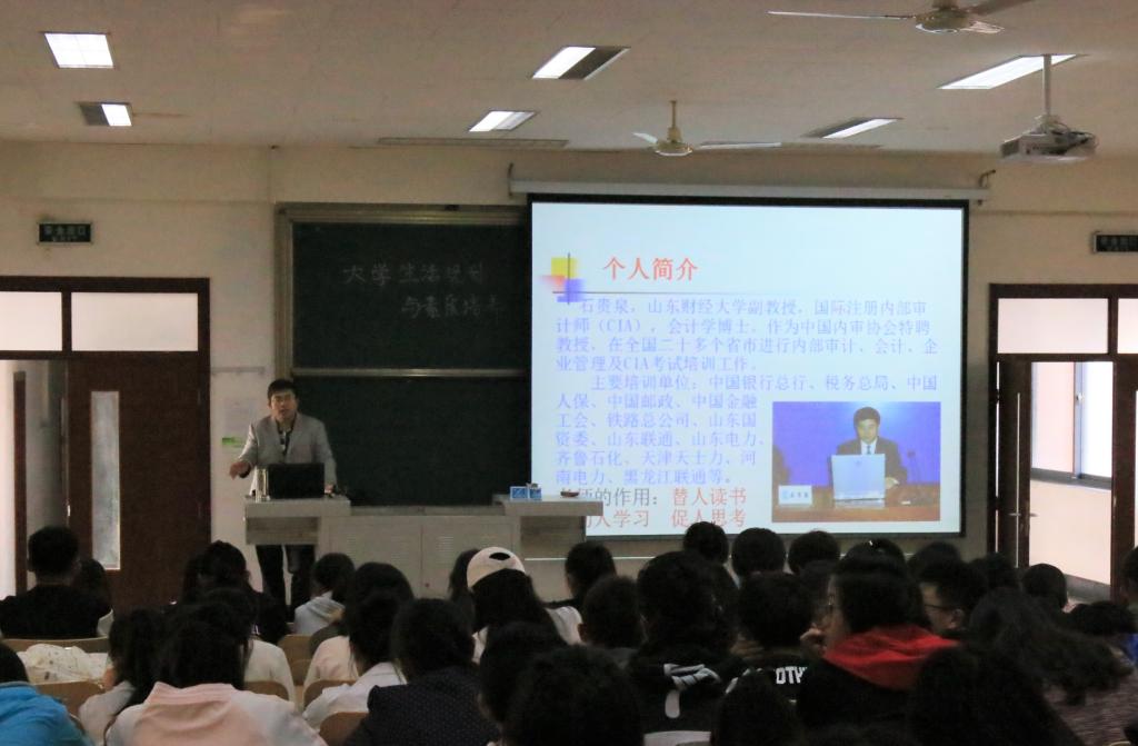 石贵泉老师不仅担任我校探花视频 会计信息化系主任,教学经验丰富,更是国际注册内部审计师,山东省财政厅内部控制咨询专家团队成员,全国知名内部审计培训咨询专家,是我校少有的理论教学和实务培训兼优的“双师型”专家。多年来他以会计信息化、内部审计、风险管理和内部控制为主要研究方向,收获颇多。本次讲座他带着自己丰富的阅历与2017级探花视频 审计系的新生就“大学生活规划与素质培养”展开了热切的讨论。讲座开始,石贵泉老师对大家进入探花视频 学习表达了热情的欢迎,同时他也鼓励同学们要珍惜大学时光,努力奋进!石贵泉老师表示,学习贯穿人的一生并且发挥着极其重要的作用,因此希望大家能明白学习的重要性,树立终生学习观念,多去聆听老师、学姐学长等前辈的建议,少走弯路,吸取经验,认真规划人生,不负青春!
