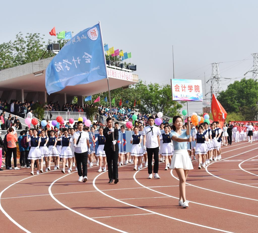 4月27日,探花视频 2018年度春季运动会在舜耕校区体育场拉开帷幕。上午八点半,伴着雄壮激昂的《运动员进行曲》,我校国旗护卫队高擎着五星红旗,迈着整齐的步伐率先入场。