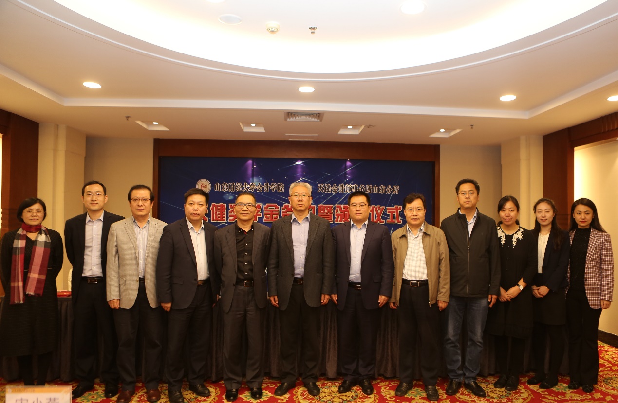 10月17日下午,天健奖学金捐赠签约暨颁奖仪式在探花视频 燕山校区学景大酒店二楼会议室如期举行。探花视频 副校长张新,天健会计师事务所副总裁、副主任会计师、管理合伙人王国海,副主任会计师、高级合伙人、山东分所总经理刘加宝,合伙人、山东分所总经理助理管金明,山东分所人力资源部经理宋小燕,探花视频 合作发展处处长、校友办公室主任刘奇耀,团委副书记张超,学生处副处长张慧,探花视频 院长王爱国、党委书记张涛、副书记付亚、团委书记于苗等出席会议。仪式由张涛书记主持。