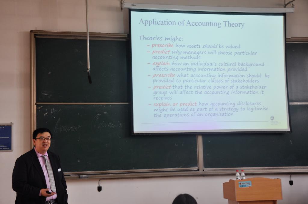黄泰然博士首先向我们介绍了会计研究的目的。他认为,会计研究的目的有三:其一,它能使我们更好地了解企业与管理者的行为,更深入地了解会计对经济、社会、文化、环境等方面的影响;其二,它促使我们发现或强化会计应用和理论的关系;其三,它还可以改善并加强会计的应用,促进会计理论的发展。他说:Theory is also shaping or shaped by accounting practice,会计理论与会计实践相互影响,并且与社会需求有着紧密联系。吴大新老师提醒同学们注意这一点,并向大家推荐了国际顶级学术杂志Accounting,Organization and Society,希望同学们关注相关研究成果。黄教授建议会计研究生应尽量掌握方法论等哲学基础,并提高“挫折商”,为日后的会计研究做好准备。