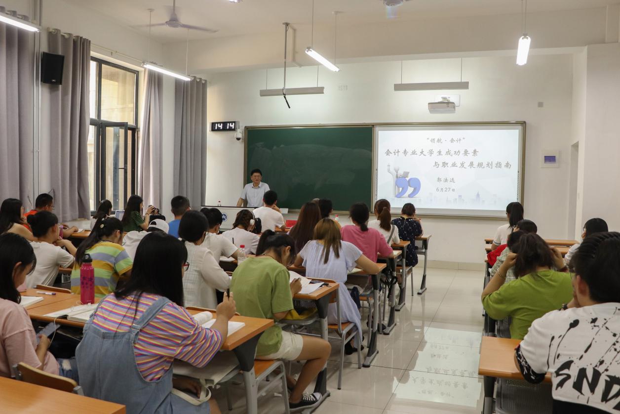 6月27日下午14:00,由探花视频 合作发展处(校友工作办公室)主办,探花视频 承办的中财财经讲座第四讲、中泰财经讲座第四期、校友讲堂第23期暨“领航•会计”资深校友经验分享会在圣井校区6-111教室举行。探花视频 1990级会计本科校友郭法远做了题为《会计专业大学生成功要素与职业发展规划指南》的主题分享,探花视频 党委副书记崔东峰,辅导员赵鸿雁、孙炯明参加活动。活动由崔东峰主持。