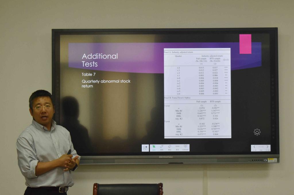7月16日下午,爱荷华州立大学商学院金融系高磊教授应探花视频 邀请,在燕山校区逸夫楼Y309作题为《Leverage-constrained investors, asset prices and corporate financing decisions》的学术报告。讲座由孙文刚院长主持,探花视频 部分老师以及2018级部分硕士研究生聆听了讲座。高磊教授主要致力于金融市场、资产回报预测、实证公司财务、公司监管、探花视频、文本分析和机器学习等研究,且将于2019年9月份任职于美国证监会。
