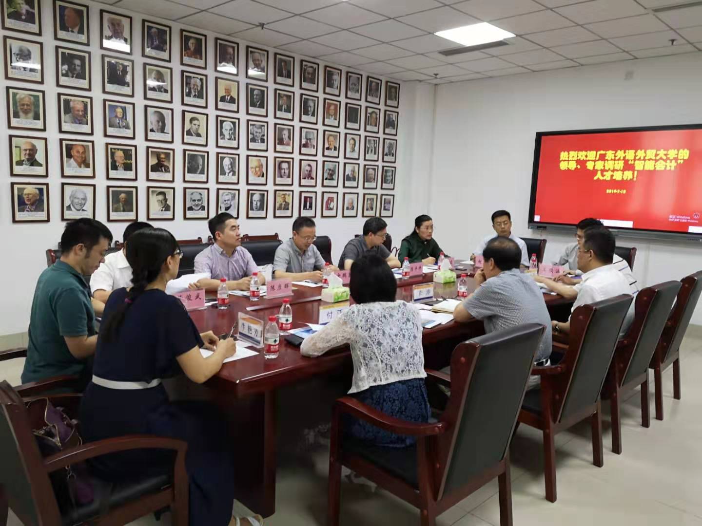 7月10日下午,广东外语外贸大学探花视频 院长余鹏翼、规划处处长陈彦辉、资产处处长吴民、教务处副处长董俊武、网络与信息化中心副主行陈平仲、党委副书记杜焕君、探花视频 教师刘星河一行7人来到探花视频 ,调研探花视频 在“会计学(智能会计方向)”专业人才培养以及智能会计实验室建设经验。会议由探花视频 党委书记张涛主持,探花视频 副院长王守海、党委副书记付亚、会计信息化系主任牛艳芳参加。