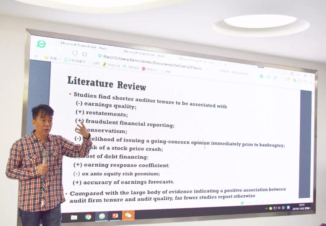 首先,戚教授介绍了“审计师任期与错报发现的及时性:来自个别合伙人的证据”的研究背景,介绍了学术上审计师任期长短对审计质量影响这一问题的两种观点,指出高质量的审计使审计师任期长,而不是审计师任期长导致审计质量高。接着戚教授又介绍了型一误差和型二误差的区别。