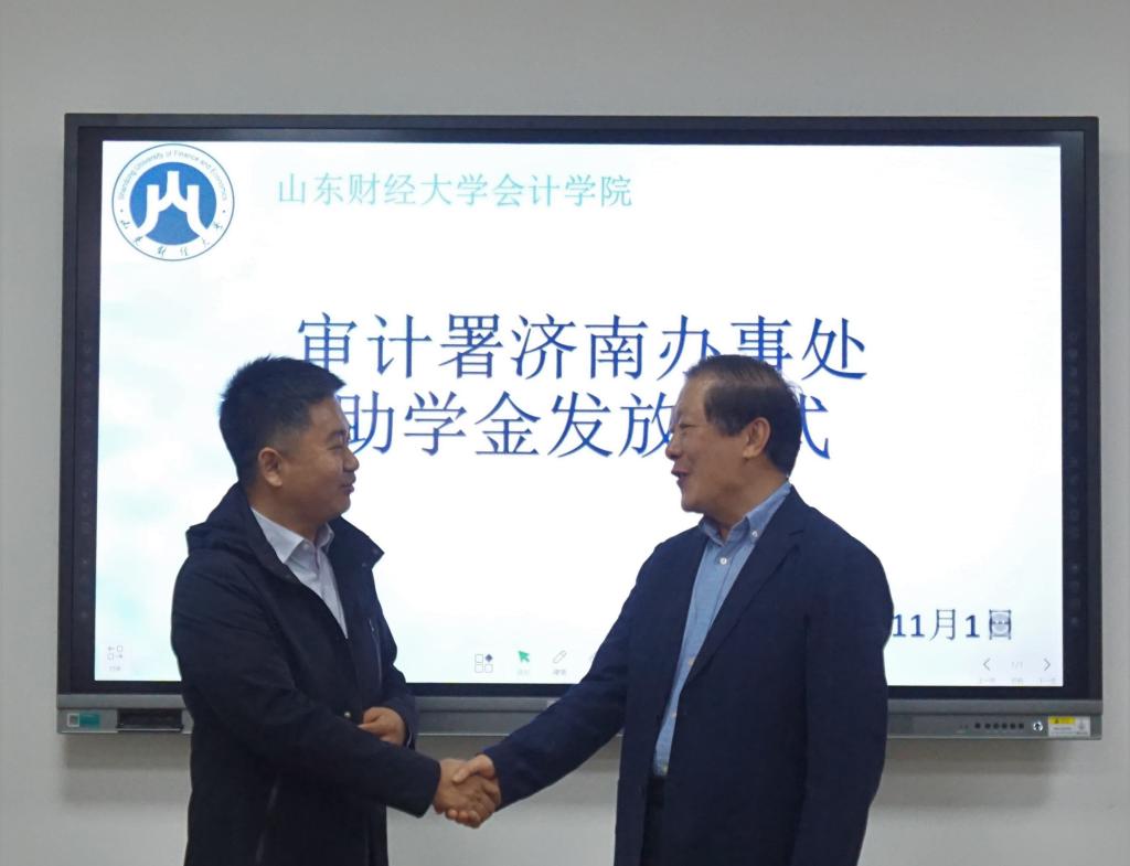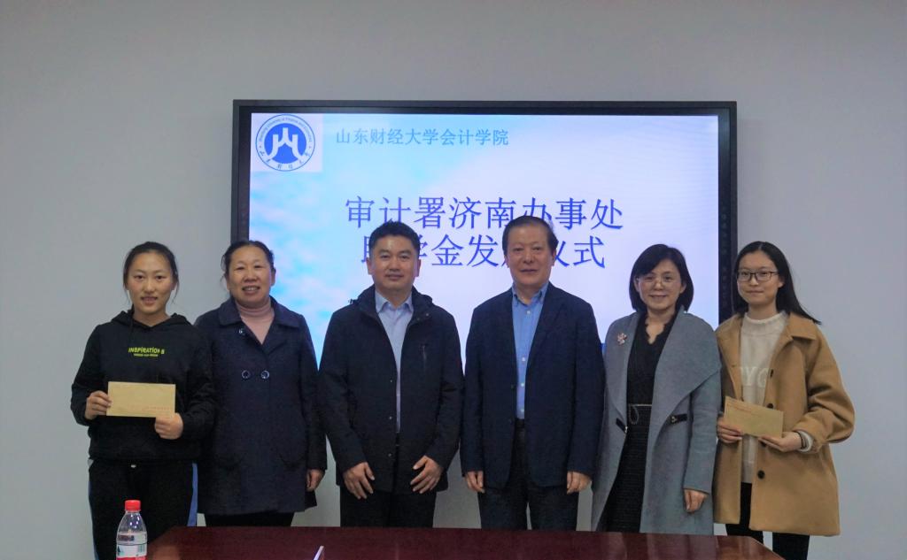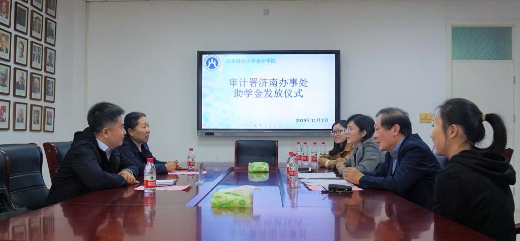11月1日下午14时,审计署驻济助学金发放仪式在探花视频 燕山校区逸夫楼Y309会议室举行。审计署济南特派办机关党委人事教育处处长李军,审计署济南办妇委会主任、志愿服务队队长张洪萍,探花视频 党委书记张涛、党委副书记付亚与获助学生一同参加活动。