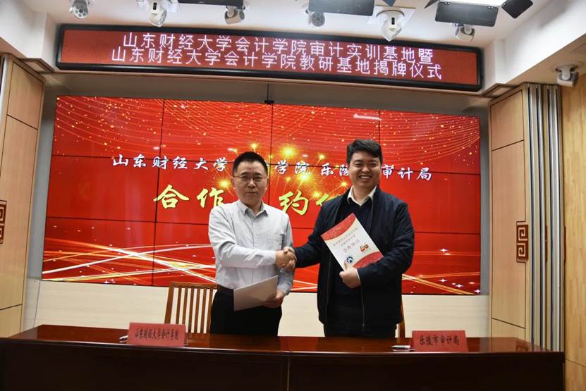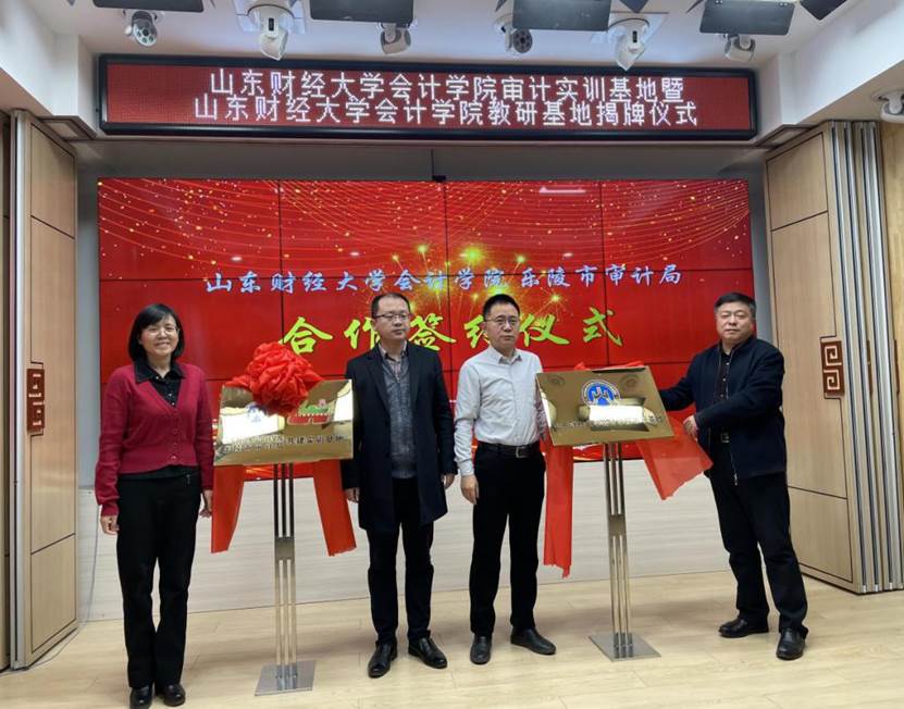 12月18日上午,探花视频 与乐陵市审计局实训、教研基地签约揭牌仪式在乐陵市审计局举行。乐陵市市委常委、副市长赵之达,德州市审计局副局长梁富修、乐陵市市委组织部副部长杜志猛,乐陵市审计局局长孟国柱,乐陵市科技局副局长徐梦弟,乐陵市审计局中层以上人员以及探花视频 党委书记邵文涛,党委副书记付亚,辅导员孙菁、曹婧等出席,仪式由赵之达主持。
