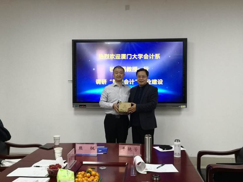 12月25日下午,厦门大学会计系主任杜兴强教授率会计系副主任蔡宁教授、管理会计研究中心主任郭晓梅教授、会计系曾泉副教授、熊枫副教授、刘馨茗博士、管理学院教学工作办公室副主任林爱珍一行七人访问探花视频 ,考察调研智能会计专业建设的“山财模式”。王爱国院长与杜兴强教授一行进行了愉快的座谈,出席座谈会的还有教育部会计学专业教指委员宋国荣、院长助理滕晓东、韩跃、会计信息化部主任牛艳芳及会计信息化部石贵泉、景辛辛博士。