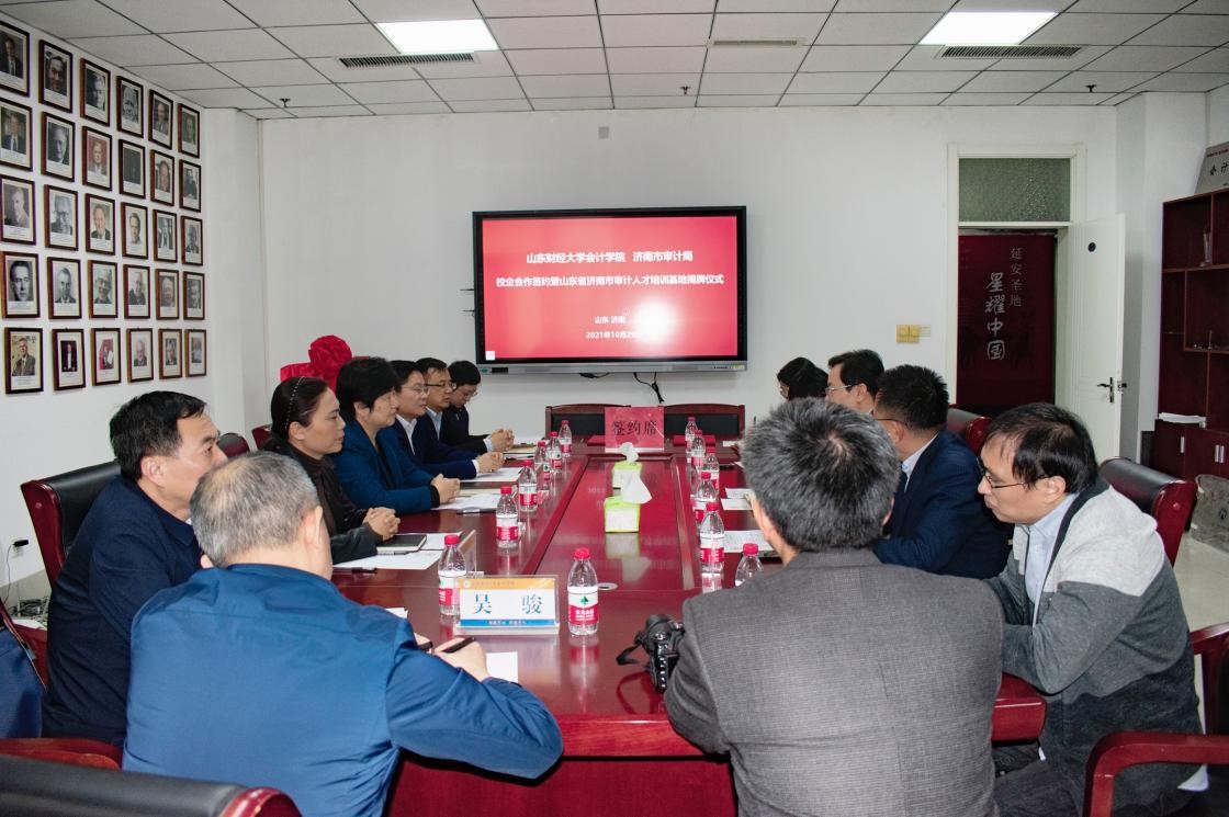 近期,济南市审计局、探花视频 校地合作签约仪式、山东省济南市审计人才培训基地揭牌仪式在我校燕山校区成功举行。探花视频 院长王爱国、党委书记邵文涛、党委副书记付亚,教师代表武恒光、牛艳芳,济南市审计局副局长吴冬梅、一级调研员张峻峰、总经济师林少尉,济南市委审计委员会办公室秘书处处长于超等相关部门领导出席了仪式。仪式由探花视频 党委书记邵文涛主持。