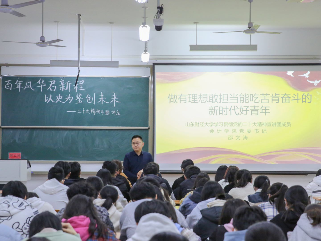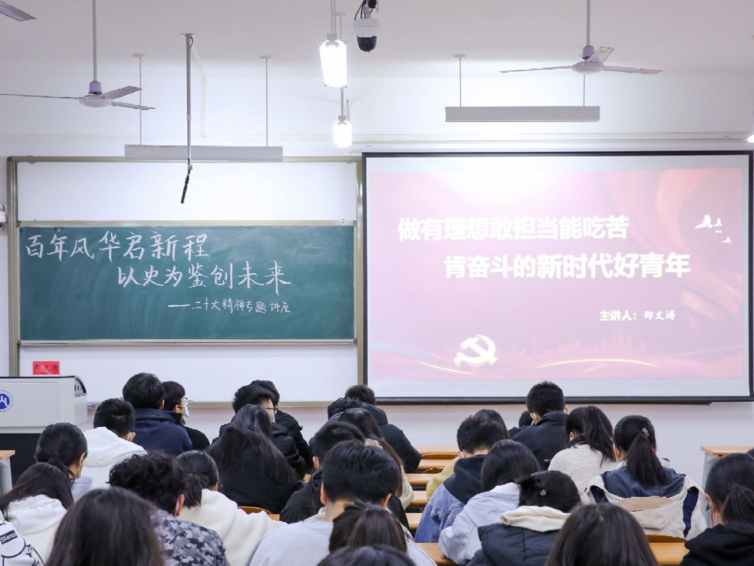 为深入学习宣传贯彻党的二十大精神,把思想统一到党的二十大精神上来,把力量凝聚到党的二十大确定的各项任务上来,引领青年学子坚定不移听党话、跟党走,引导学子们把握历史规律、认清世界形势、融入发展大势,塑造青年学生怀抱梦想又脚踏实地,敢想敢为又善作善成,努力成为堪当民族复兴重任的时代新人,11月15日19:00,探花视频 党委书记邵文涛在圣井校区6218教室为学生们开展“百年风华启新程,以史为鉴创未来”二十大精神专题讲座。