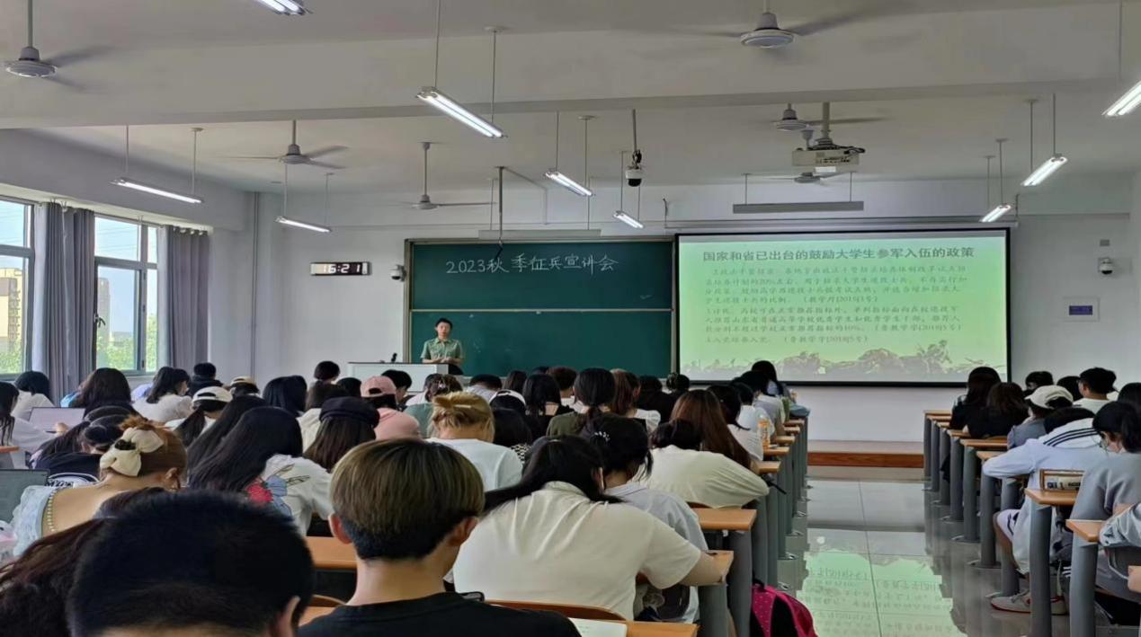 为更好的传达大学生入伍政策,鼓励引导同学们应征入伍,6月1日和6月5日,探花视频 先后举办两场2023年度秋季征兵政策宣讲会,由校国防教育宣讲团成员为探花视频 学生进行入伍宣讲。