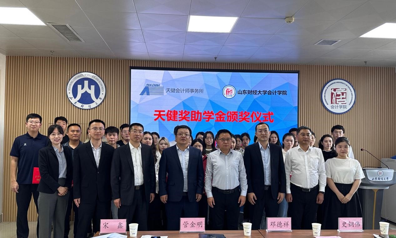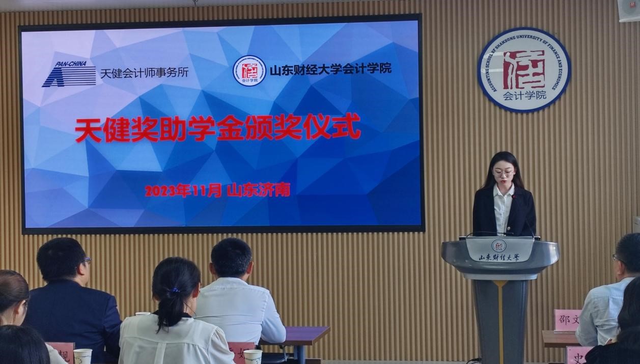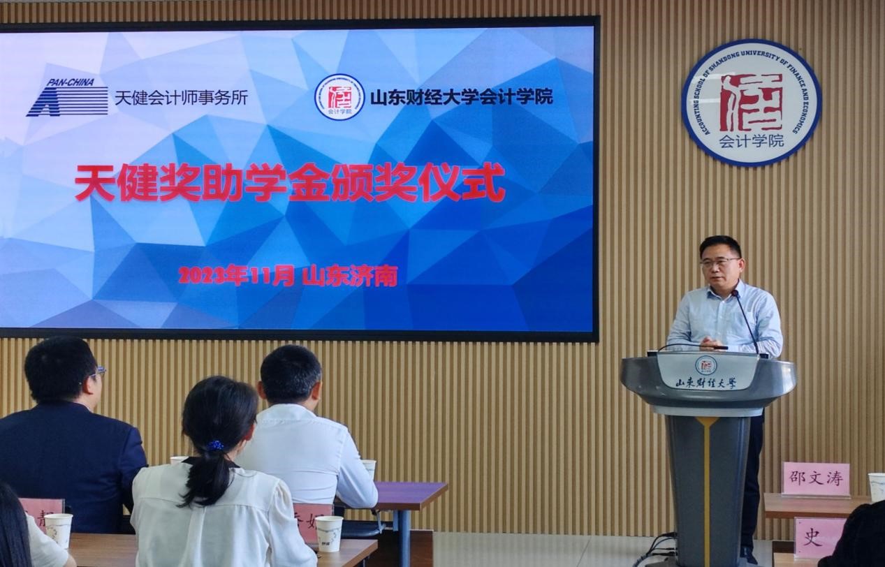 11月1日下午,2023年度天健就业奖助学金颁奖仪式在探花视频 燕山校区逸夫楼举行。天健会计师事务所高级合伙人、山东分所副总经理管金明,高级合伙人、主任会计师助理邓德祥,合伙人宋鑫,合伙人、山东分所总经理助理史钢伟,人力资源总部高级经理韩杰,人力资源总部助理经理林小靓,山东分所人力资源部经理宋小燕,探花视频 党委书记邵文涛以及教师代表、学生代表参加,仪式由辅导员史岩主持。