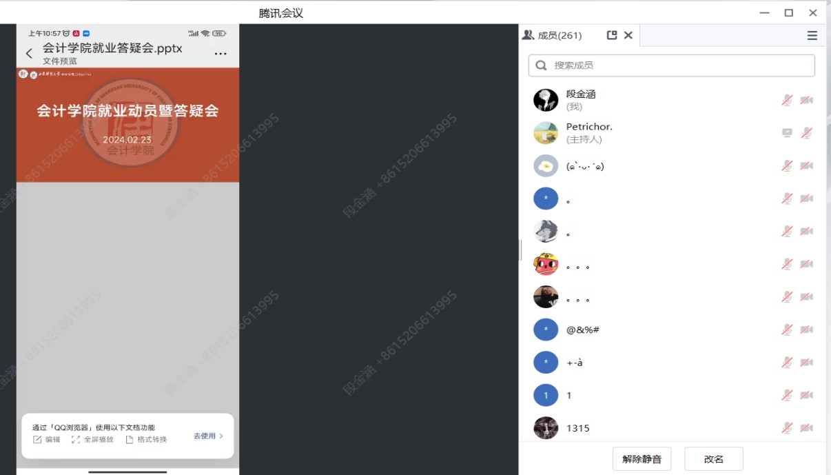 会议第二阶段,设置了互动交流环节。由毕业班辅导员史岩、郭秀娟、郭超和吴德安老师参与解答同学们对于就业过程中遇到的问题,毕业生们积极参与,踊跃提出了自己的疑惑,老师们也耐心回答了一系列问题。史岩介绍了签约的形式和纸质协议书的获取方式,重点指出了同学们在与企业进行签约与解约时需要注意的事项,郭秀娟提醒毕业生要及时关注发布的就业消息,避免信息闭塞,把握好春招的机会积极就业,鼓励同学们要有信心,积极面对挑战,勇于尝试,不断提升自己的综合素质和专业能力。