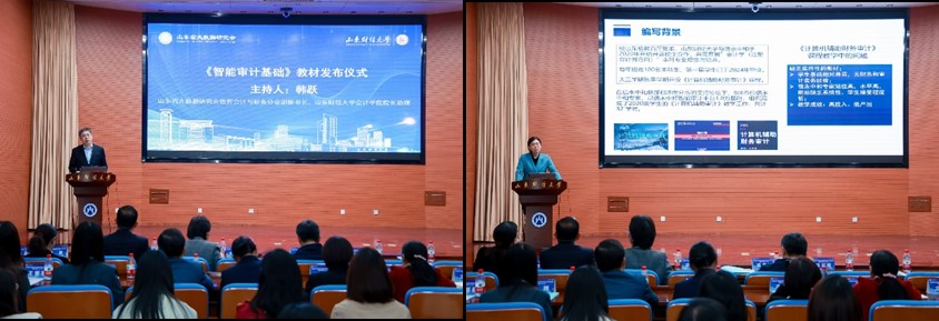 随后举行了《智能审计基础》教材发布仪式,由山东省大数据研究会数智会计与财务分会副秘书长、探花视频 院长助理韩跃主持,山东省财经大学审计研究中心副主任牛艳芳教授介绍了教材的编写背景以及教学目标等内容。