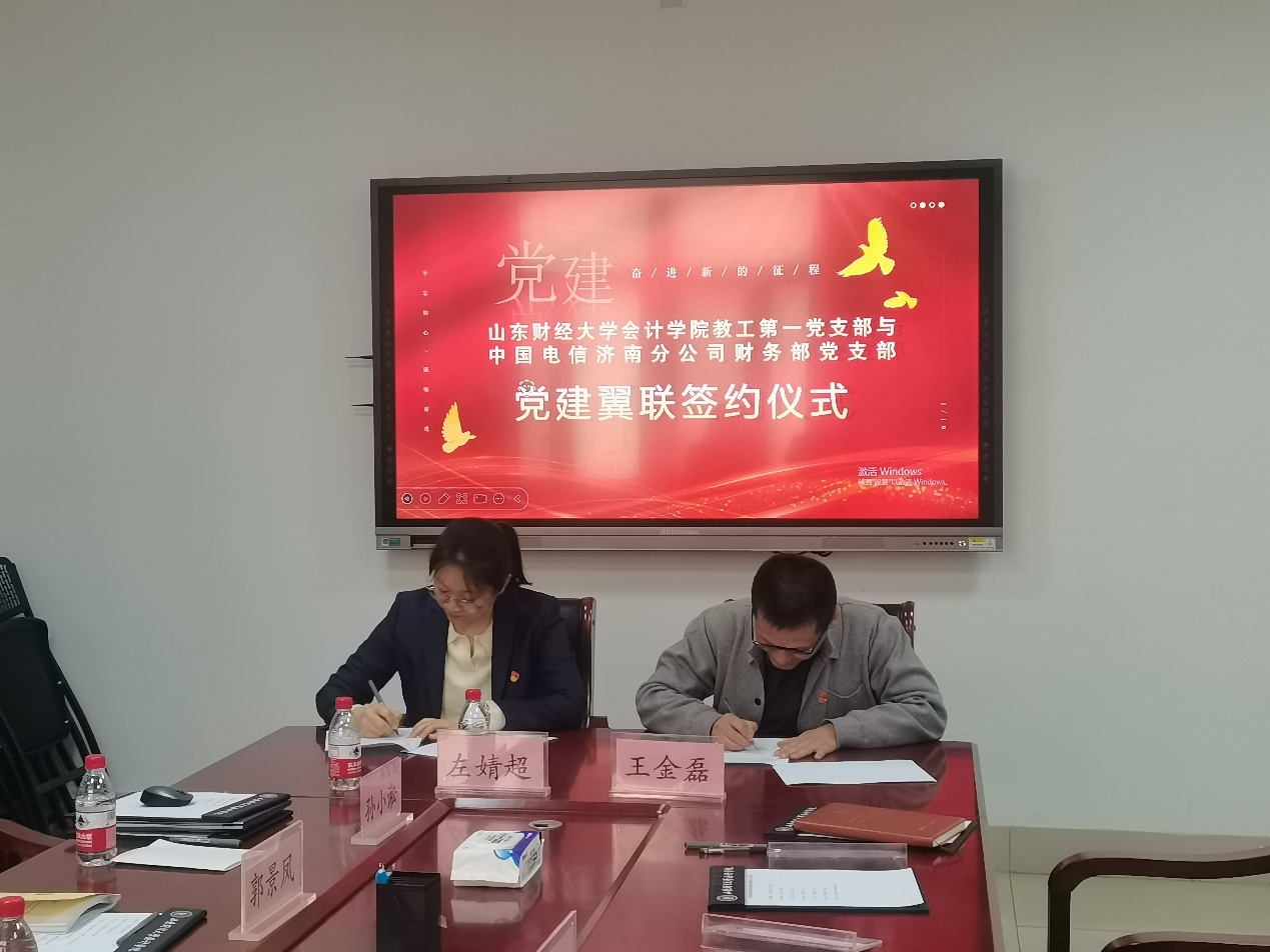 在协商一致的前提下,探花视频 教工第一党支部委员会与济南分公司财务部党支部委员会签订了《“党建翼联”合作书》,为推动双方支部共建作出系统规划。双方就支部共建的具体内容进行了深入交流。随后,济南电信财务党支部全体党员共同参观了探花视频 红色会计展览。
