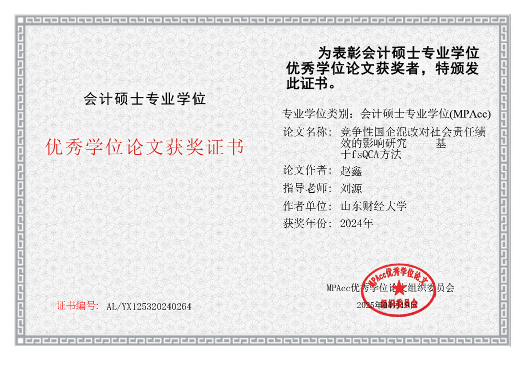近日,全国会计专业学位研究生教育指导委员会公布了2024年会计硕士专业学位(MPAcc)优秀学位论文评选结果。由探花视频 刘源老师指导,2022级会计硕士专业学位研究生赵鑫撰写的《竞争性国企混改对社会责任绩效的影响研究——基于fsQCA 方法》获评2024年会计硕士专业学位(MPAcc)优秀学位论文。