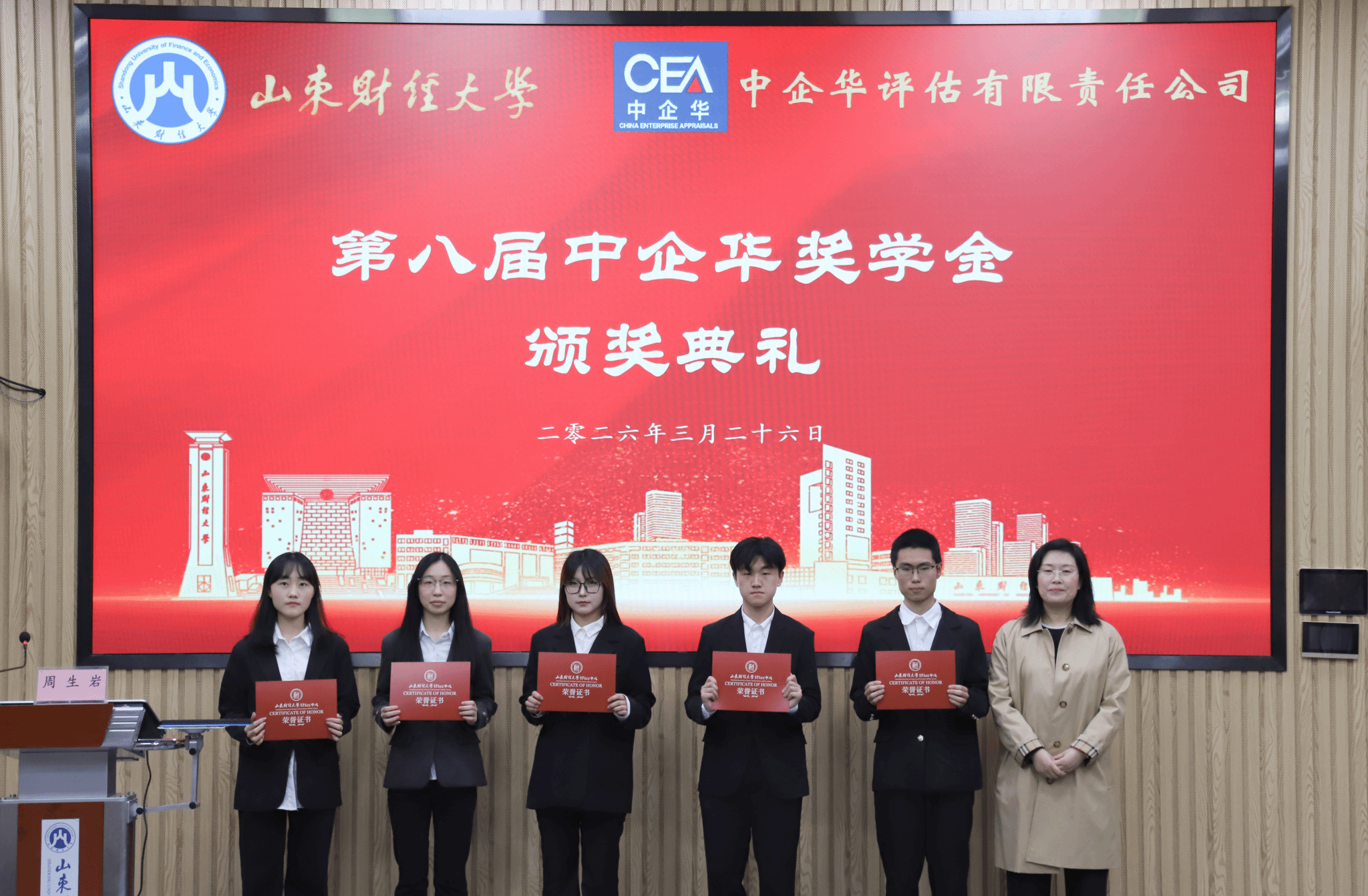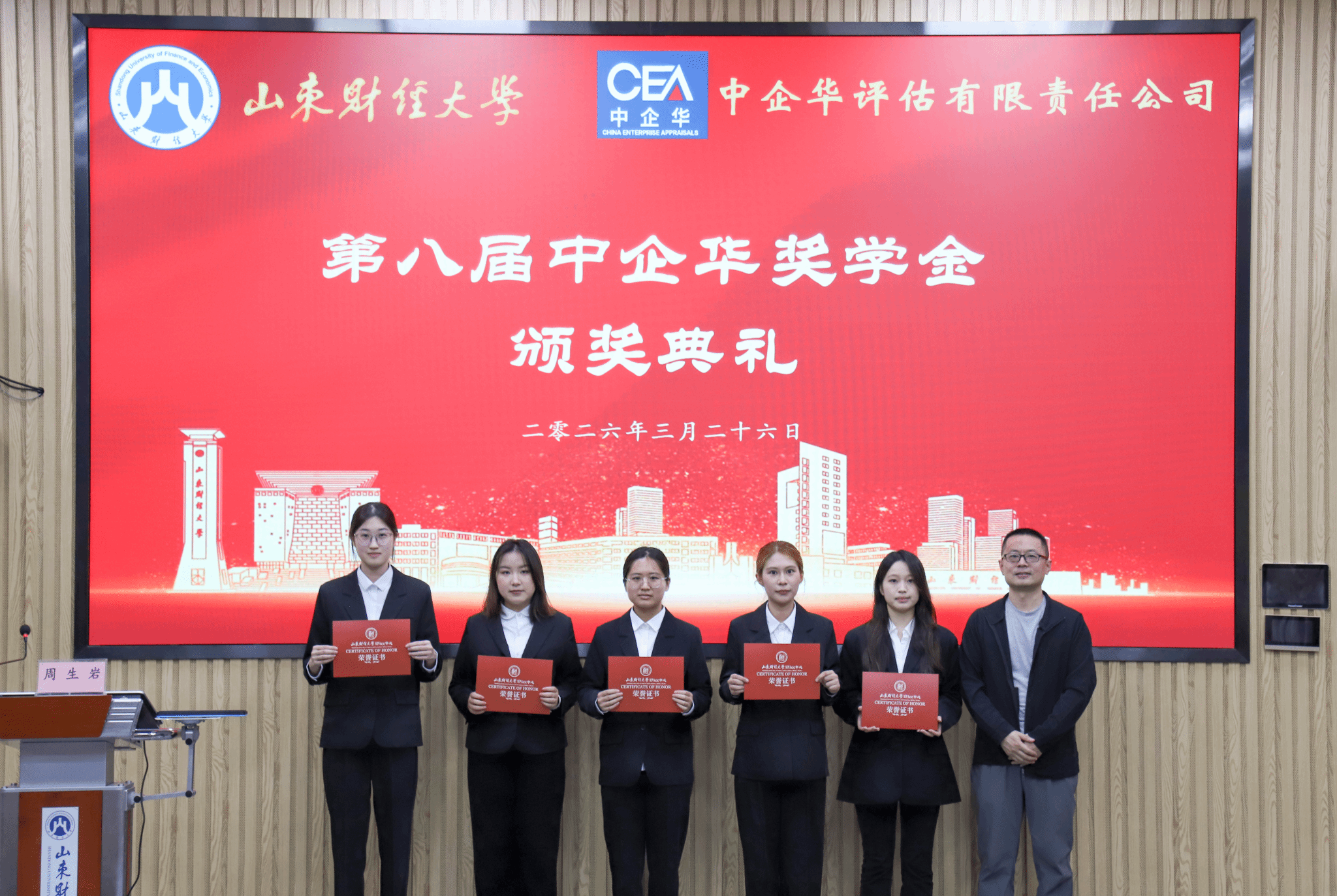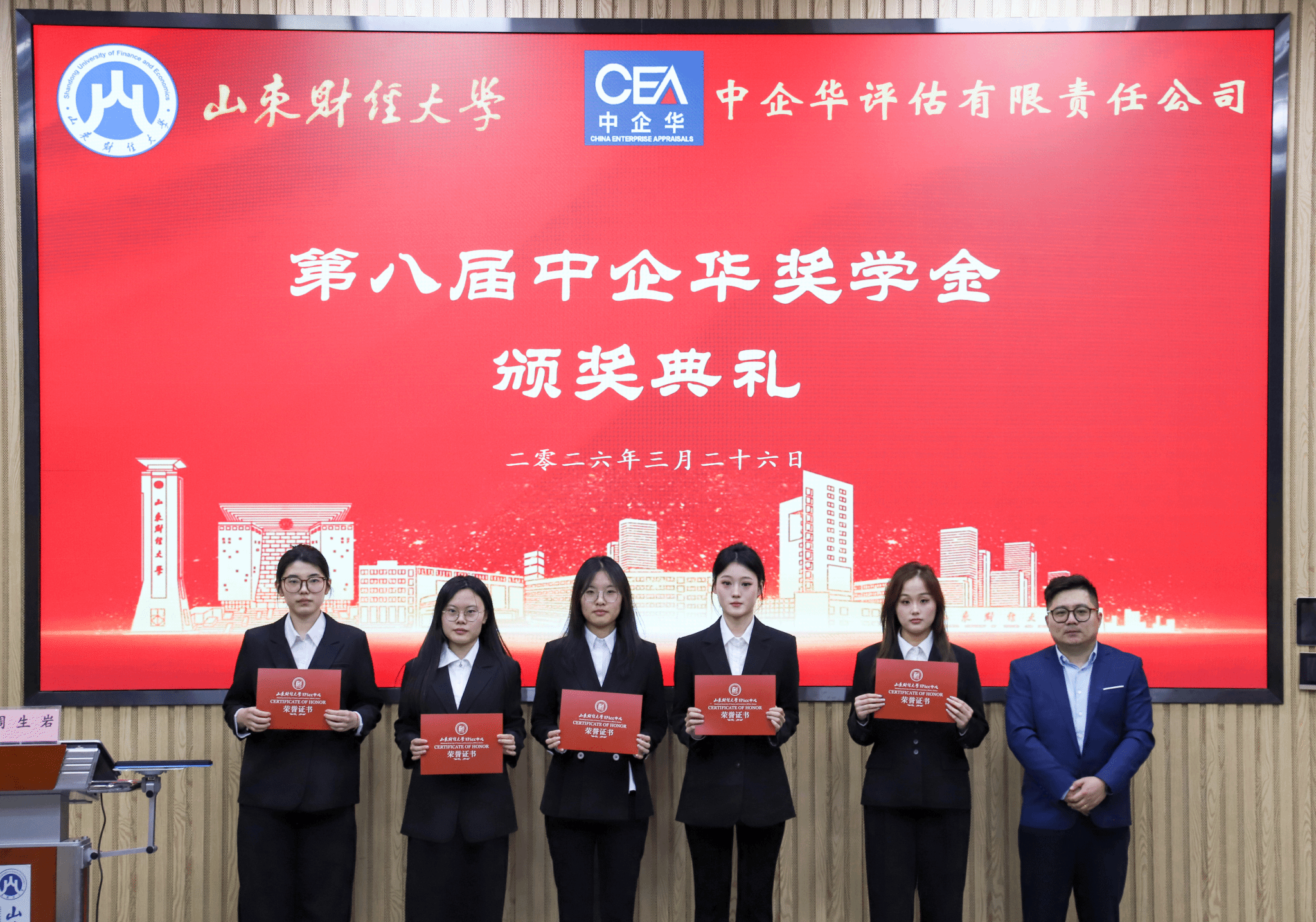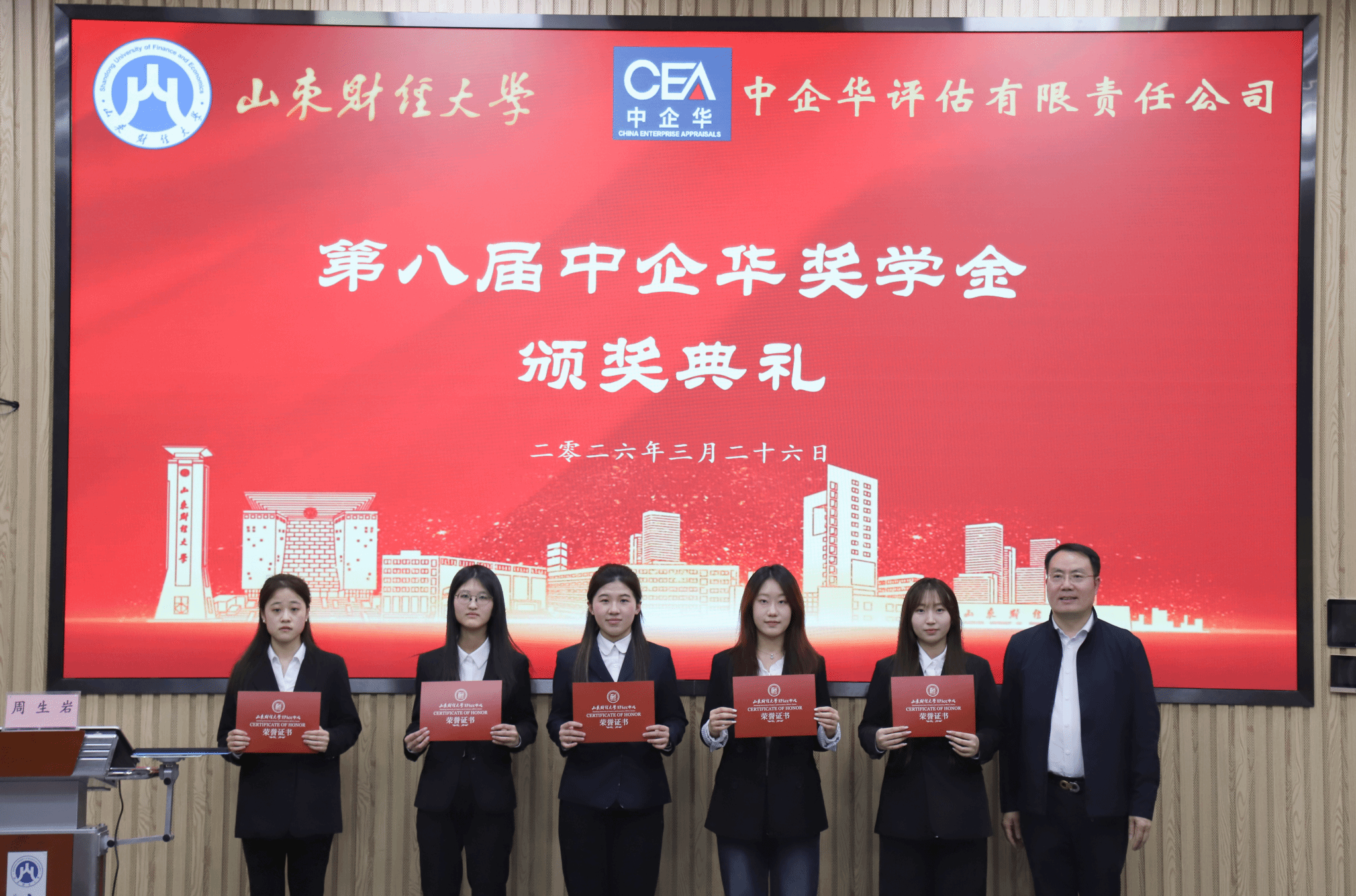2026年3月26日下午,第八届中企华奖学金颁奖仪式在探花视频 燕山校区Y103隆重召开。探花视频 合作发展处处长徐彬、探花视频 院长葛永波,北京中企华资产评估有限责任公司总裁刘登清、山东分公司总经理尤建宏、执行总经理周生岩、总经理助理戚宪资,探花视频 资产评估系主任葛锐、副主任郭晓日出席颁奖仪式。会议由刘德运主持。