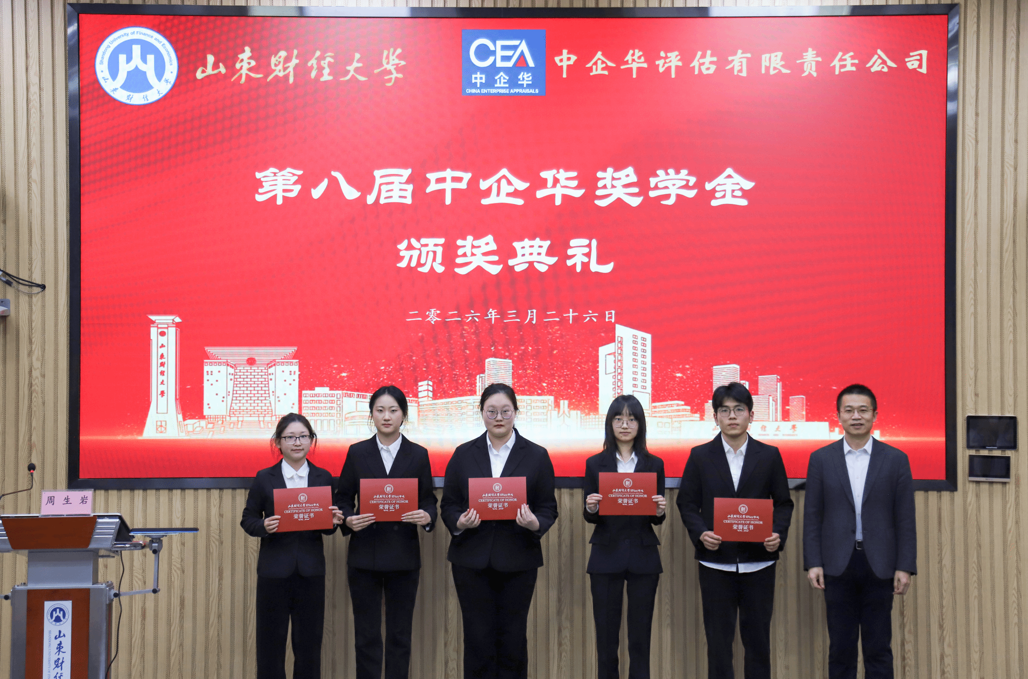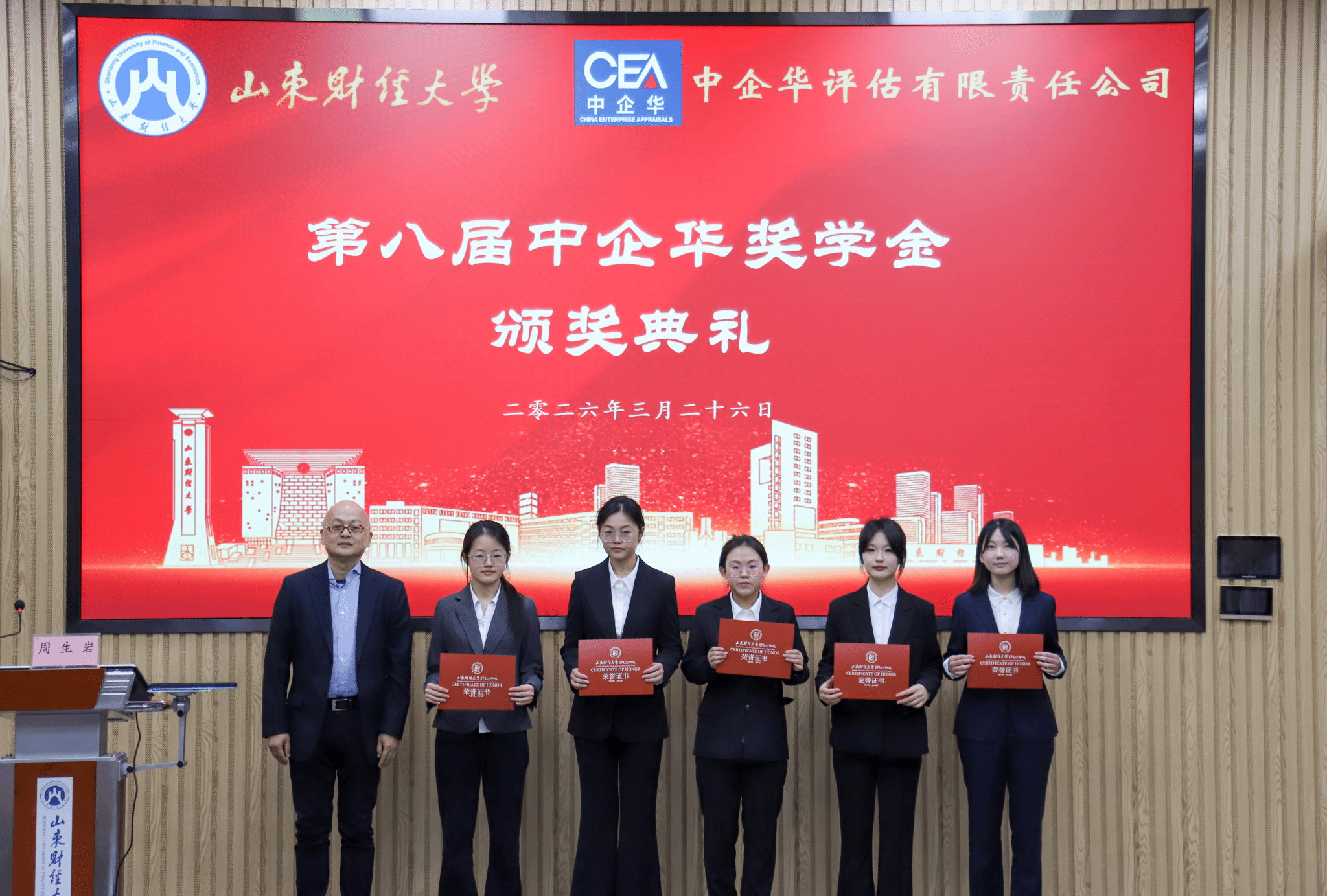 致辞结束后,周生岩宣读获奖学生名单,与会嘉宾为获奖同学颁奖并合影留念。