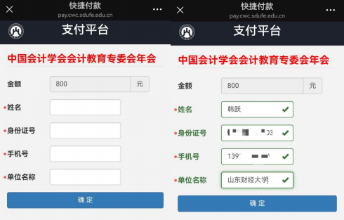 第二步,扫码后您将看到以下界面,需要您填写信息 (右图为填写示例),并点击“确定”