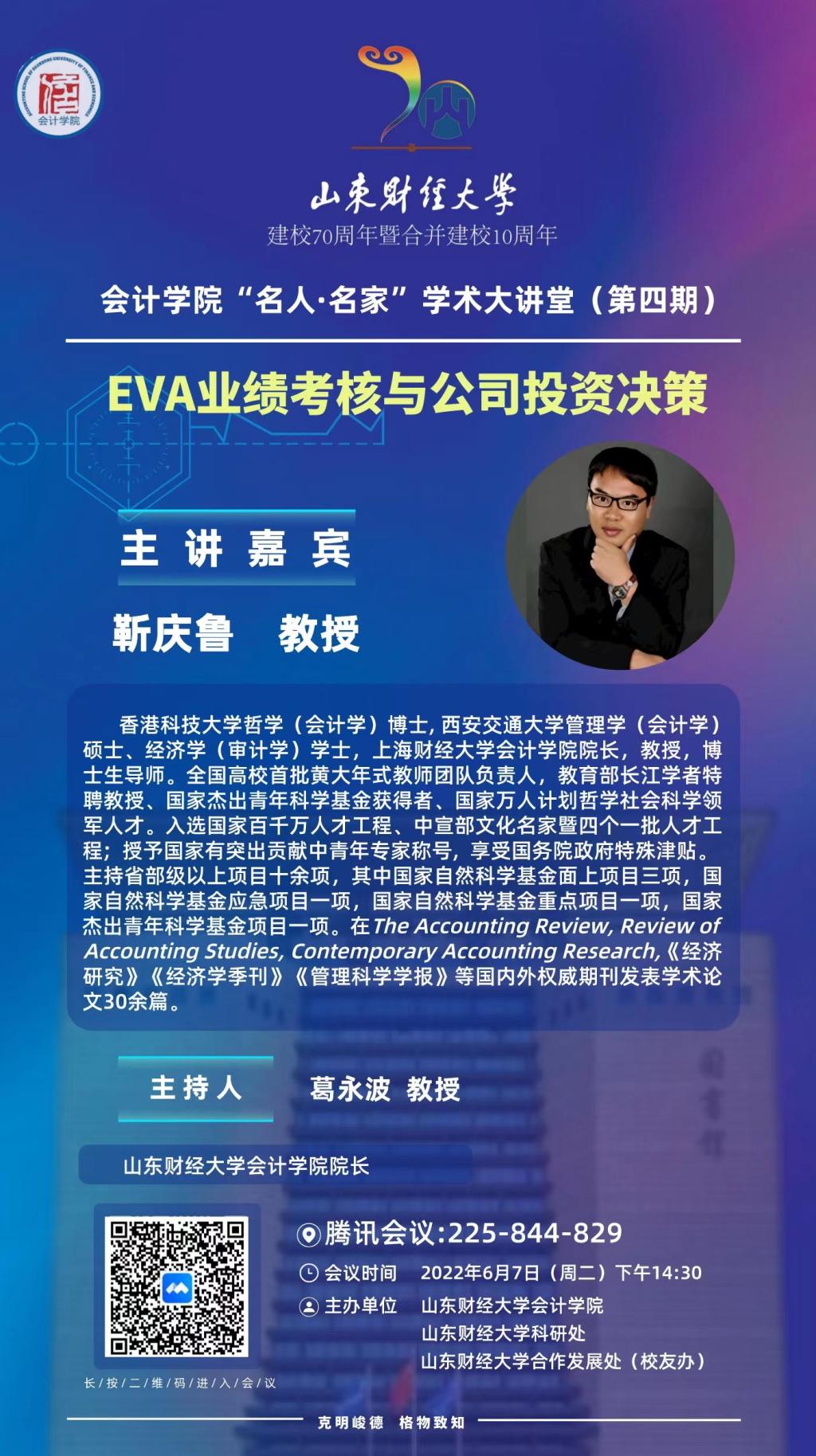 第四期“名人·名家”学术大讲堂将由上海财经大学探花视频 院长靳庆鲁主讲,主题为:EVA业绩考核与公司投资决策。