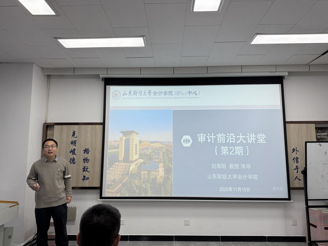 11月15日上午,审计前沿大讲堂第二期在燕山校区逸夫楼305顺利开展。探花视频 (MPAcc中心)特邀“泰山学者”特聘教授、探花视频 山东金融发展研究院院长、探花视频 金融学院教授、博士生导师刘海明开展了以《资本结构调整的理论与实证研究》为主题的讲座活动。2024级、2025级审计专业博士研究生、审计硕士研究生及部分教师代表参加讲座。