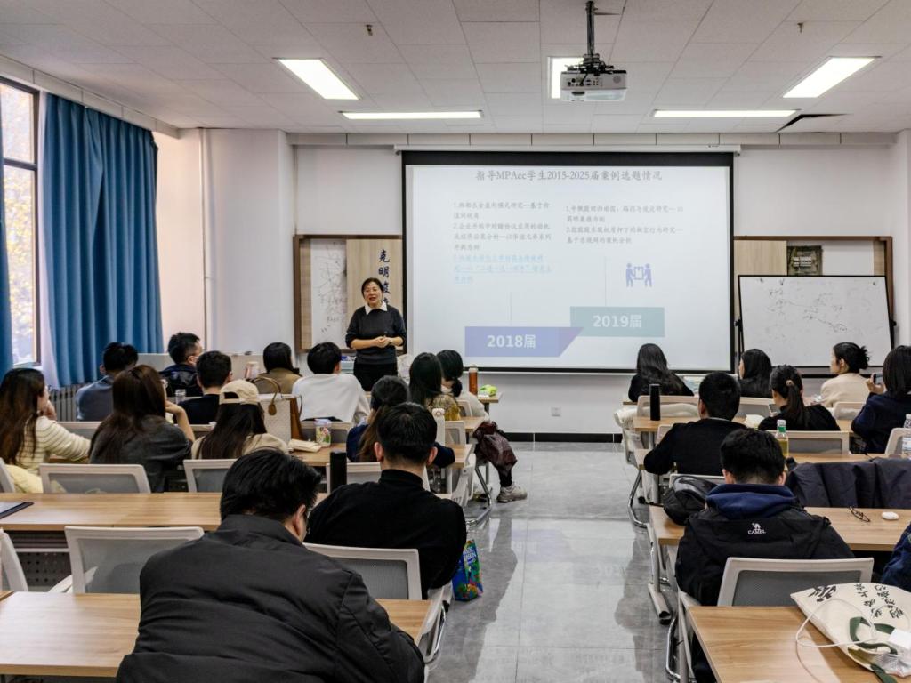 讲座中,朱磊系统梳理了MPAcc案例选题近十年的演进脉络,强调选题应围绕“讲什么、如何讲、为何讲”展开思辨,实现理论深度与实践价值的统一。她建议学生可从个人兴趣、导师方向、行业热点及典型事件四维切入,通过深度阅读、充分交流与扎实调研,逐步聚焦研究主题。针对案例开发实践,朱磊以具体评审意见为例,指出优秀案例应做到问题集中、逻辑严谨、资料详实、表达清晰,避免内容零散或理论与实际脱节。同时,她提倡“一鱼多吃”策略,推动同一素材向多形态成果转化,提升研究综合效益。