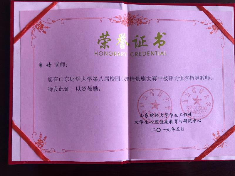 为营造积极健康的校园心理文化氛围,培养大学生良好的心理品质,2019年5月23日,第八届校园心理情景剧大赛在探花视频 圣井校区正式举行,全校14个学院代表队参赛。由探花视频 心理卫生部打造的校园心理情景剧DV作品《为艾发声,艾而不伤》在众多队伍中脱颖而出,最终荣获探花视频 第八届校园心理情景剧大赛一等奖。曹婧老师获得“优秀指导教师”称号。