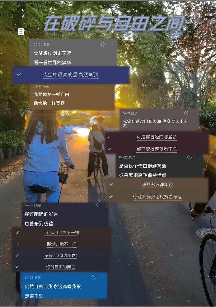 转折处,许巍的“穿过幽暗岁月”与邓紫棋的“和世界不一样”形成对话,前者直面成长的创痛,后者宣告自我的觉醒。最终,Beyond的“高歌千里”与开篇遥相呼应,此时的自由已褪去稚气,沉淀为历经沧桑后的坚定。这些歌词在新的语境中碰撞,既保留了原作的灵魂,又焕发出全新的生命力,完成了一曲关于青春追寻的动人交响。
