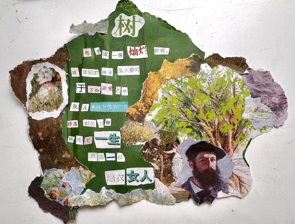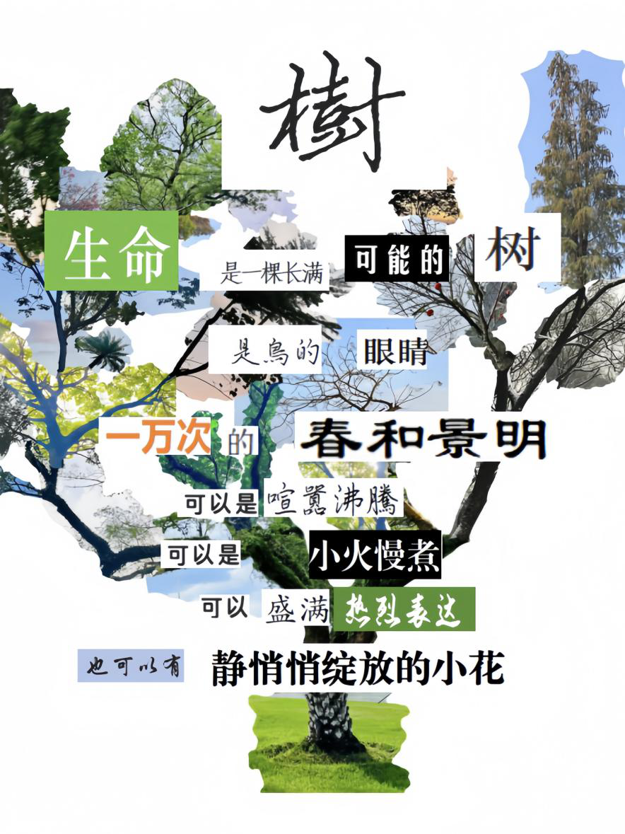 在创作这首拼贴诗时,我深受启发,想要通过文字和图像的结合,探索生命的深邃与丰富。我选择了“树”作为生命的象征,因为树在我心中代表了成长、坚韧和变化,这些都是生命不可或缺的元素。生命,对我而言,是一种不断成长和变化的过程。它充满了未知和可能性,正如一棵长满可能的树。每一片叶子、每一根枝干都是生命故事的一部分,它们在时间的流转中展现出不同的面貌。生命也如同四季更替,有时是春天的生机勃勃,有时是秋天的沉静内敛。它既可以是喧嚣沸腾的,也可以是小火慢煮的,充满了动态和静态的对比。