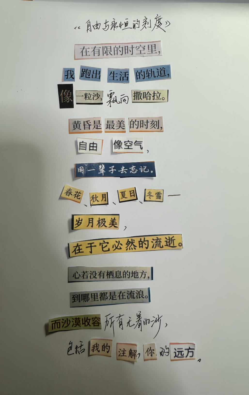 这首诗以三毛式的流浪情怀为基调,构建了一个关于自由、时间与归宿的哲思空间,比如在开篇"跑出生活的轨道"一句,是意为要以挣脱的姿态对待生活,将生命喻为飘向撒哈拉的沙粒,暗喻个体在时空约束中对永恒的追寻。在第二段中,我用书上本就有的"黄昏/自由/忘记"的意象链来揭示自由的双重性——既如空气般无处不在,又需以一生为代价来参透。中段"岁月极美"的顿悟,通过四季轮回的意象,道出存在主义式的生命感悟:真正的美源于流逝的必然性。末段"心若没有栖息的地方"深化流浪主题,我认为沙漠作为终极意象的包容者,既收容无着的沙粒(个体),也接纳所有情感投射(注解与远方),最终在存在与虚无间达成诗意平衡。想要通过以"沙-沙漠"作为核心的诗中意象,完成从逃逸生活到接纳生命的精神闭环。