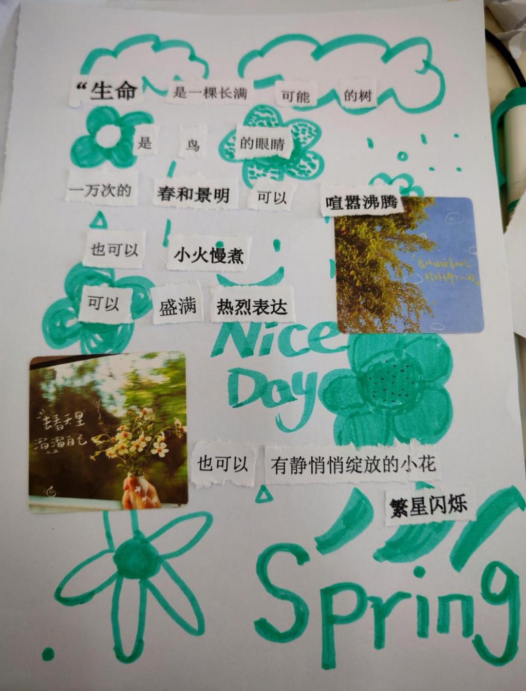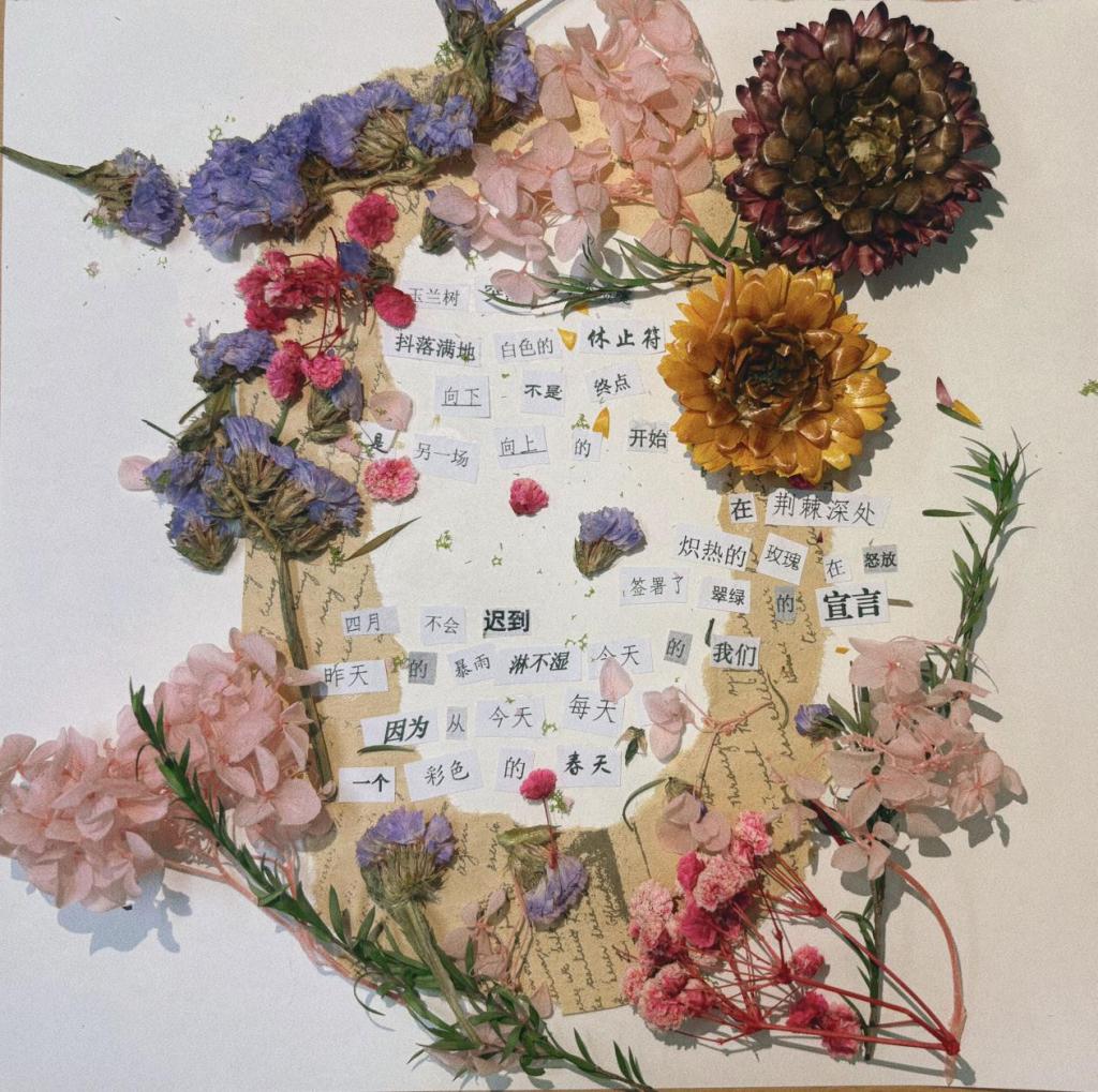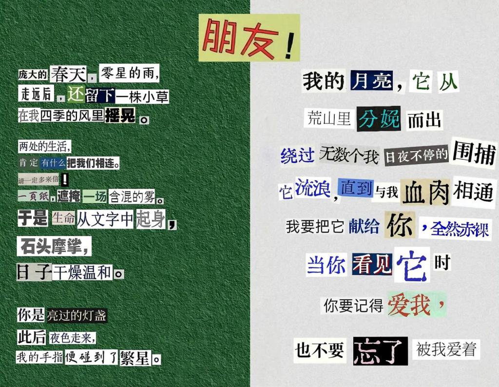 春风轻拂,万物复苏,不仅大自然换上了斑斓的新装,我们的心田也悄然绽放出对生活的无限憧憬。“生活不止眼前的苟且,还有诗和远方的田野。”这句温柔的话语,如同一缕温暖的阳光,穿透日常的琐碎,照亮了我们内心深处对美好事物的向往。让我们在文字的海洋中遨游,用碎片拼接出心中的宇宙,让青春的风采在诗行间跃动。为了让同学们发现生活中的美好,探花视频 特此举办“意剪生活画,诗写青春风”拼贴诗主题活动。接下来,让我们一起走进22级同学们精心构筑的拼贴诗世界吧。