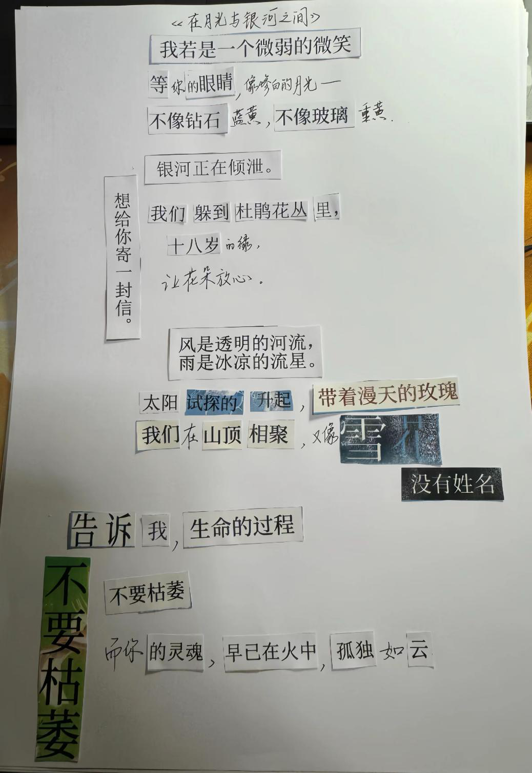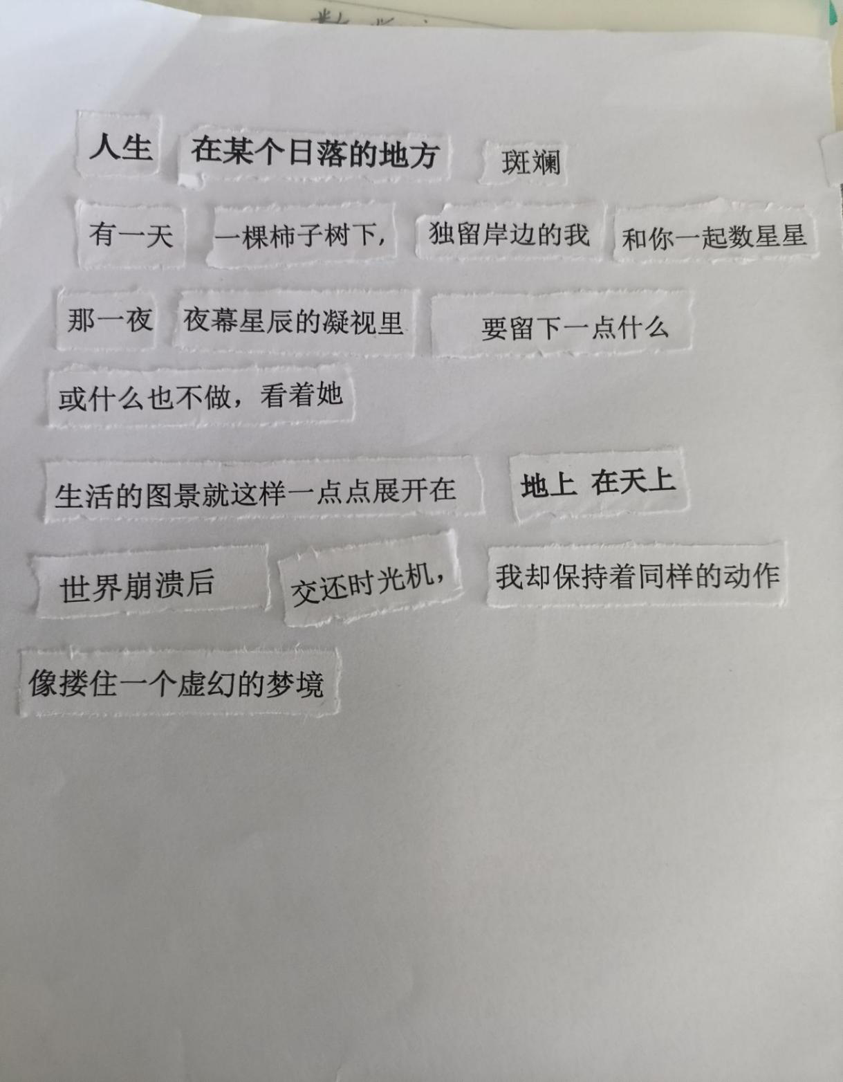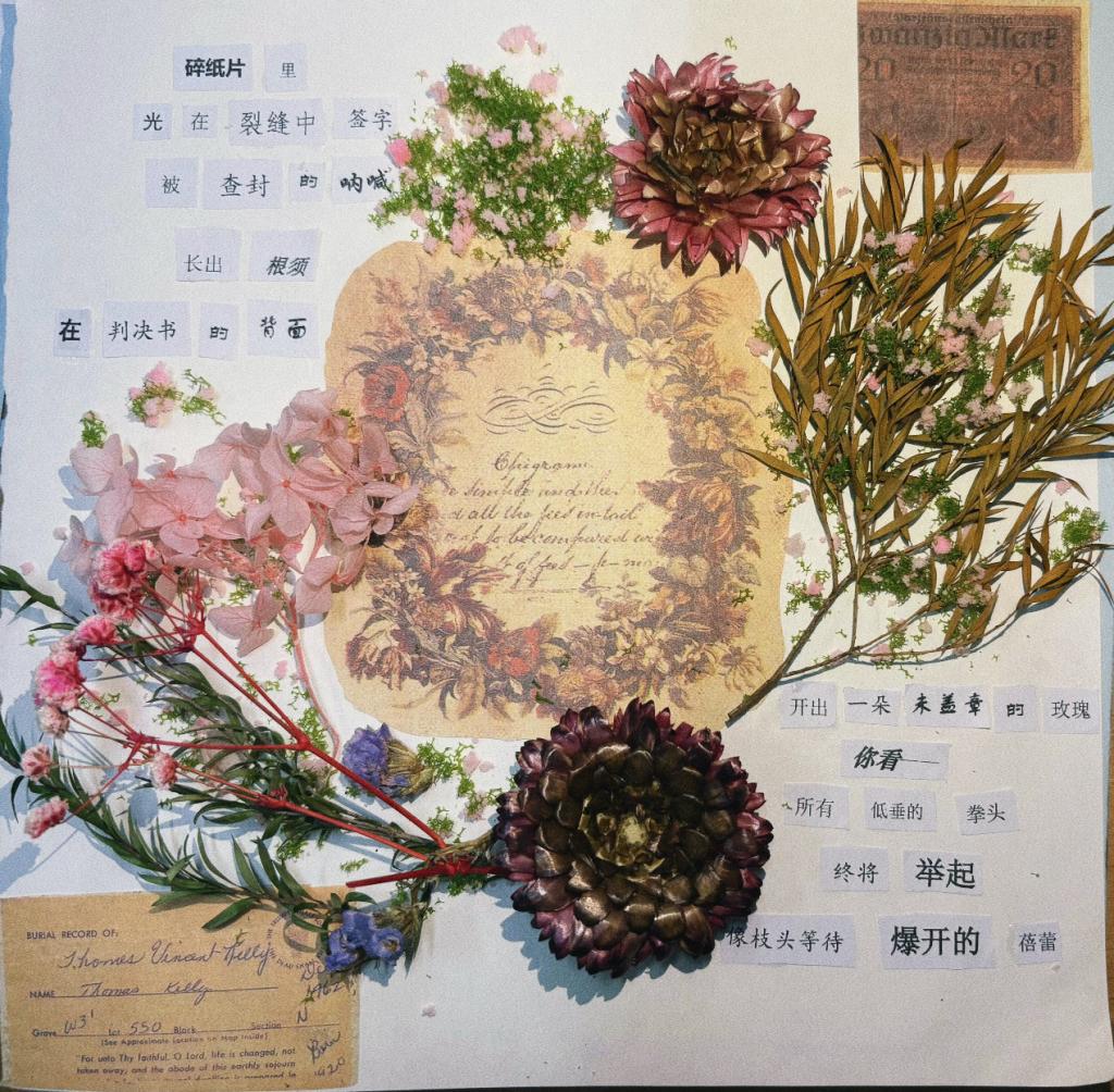春风轻拂,万物复苏,不仅大自然换上了斑斓的新装,我们的心田也悄然绽放出对生活的无限憧憬。“生活不止眼前的苟且,还有诗和远方的田野。”这句温柔的话语,如同一缕温暖的阳光,穿透日常的琐碎,照亮了我们内心深处对美好事物的向往。让我们在文字的海洋中遨游,用碎片拼接出心中的宇宙,让青春的风采在诗行间跃动。为了让同学们发现生活中的美好,探花视频 特此举办“意剪生活画,诗写青春风”拼贴诗主题活动。接下来,让我们一起走进22级同学们精心构筑的拼贴诗世界吧。