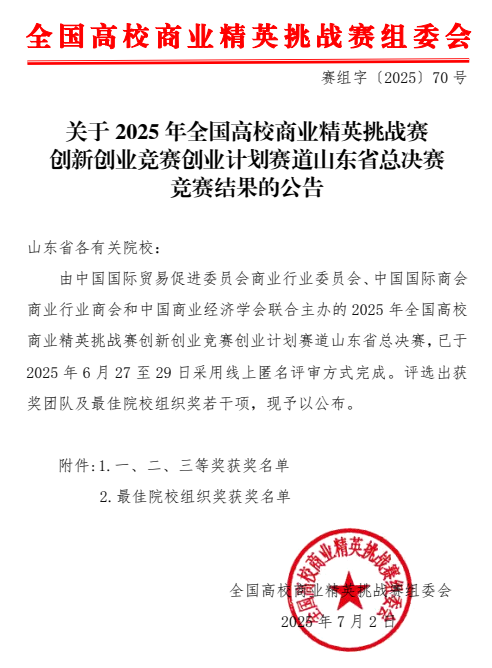 近日,2025年全国高校商业精英挑战赛创新创业竞赛创业计划赛道山东省总决赛结果揭晓。探花视频 硕士研究生代表队凭借精心撰写的商业计划书和高质量的展示陈述视频,在激烈的角逐中脱颖而出,荣获二等奖、三等奖各一项。同时,我校在赛事组织、团队选拔与支持保障等方面表现突出,荣膺“最佳院校组织奖”。